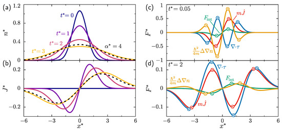 An overview of the dynamics is given in Figure 1. The one-body density, Figure 1a, possesses initially a sharp peak which broadens after switching off . The current, Figure 1b, points away from the center of the density peak. For we show n and for two different interaction lengths, and 4. The differences between both cases are relatively small. The dynamics are driven by the different terms on the right hand side of Equation (3); corresponding results for each of these terms are shown at times and in Figure 1c,d, respectively. At early times the dynamics are dominated by contributions proportional to which arise from spatial variations from the density and are also referred to as the non-interacting quantum stress tensor [15]. For later times the contribution of to the current is the most prominent one. The internal force density is relevant at both early and late times.