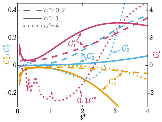 where , and , and is a convolution kernel that will in general be non-local in space and time. For simplicity, we use a Markovian and spatially local approximation for . To compensate for the resulting lack of memory, we let the strength of the Markovian form depend explicitly on time t. Hence we replace in Equation (8) by , where the amplitude carries an explicit time dependence, which allows us to match the overall amplitude of the theoretical spatial profile to the exact numerical data. Figure 2a–c show that the theory captures the excess contribution to the stress tensor well for the different values of the interaction length considered here. The value of at each time, see Figure 3, is determined by fitting (least squares) the convolution Equation (8) to the exact numerical solution.