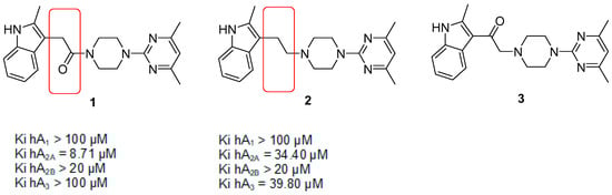 In our previous work, we had developed a hA2AAR-selective ligand, 1. An observation based on such work indicated that a simple chemical modification in the scaffold of 1 was able to convert a selective hA2AAR ligand with Ki hA2AAR = 8.71 μM and selectivity hA2AAR/hA3AR > 12 into a non-selective ligand, 2, with Ki hA2AAR = 34.40 μM and Ki hA3AR = 39.80 μM (Figure 1). In other words, the simple removal of the carbonyl group of amide in 1 had led to the loss of binding selectivity towards the hA2AAR [].