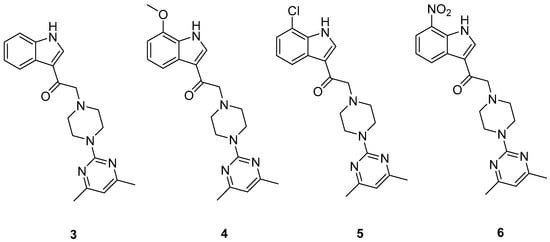 General procedure for synthesis of mIPP and its derivatives (3–6). Chloroacetylindole (1 equiv.) was added to a stirred mixture of 4,6-dimethyl-2-(piperazin-1-yl)pyrimidine (1 equiv.), potassium carbonate (3 equiv.) and sodium iodide (1 equiv.) in 60 mL of acetonitrile. The reaction mixture was stirred under reflux for 4 h. Upon completion of the reaction determined by TLC analysis, the reaction mixture was cooled to room temperature and acetonitrile was removed in vacuo to give a dry residue. The dry residue was washed with water to remove the salts and the precipitate was dissolved in methanol and dry-loaded onto silica gel. Crude dry-loaded on silica gel were purified by column chromatography (EA: Hexane = 1:100–3:1) to give mIPP and its derivatives.