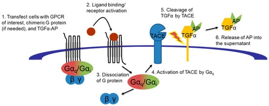 - Inoue, A.; Ishiguro, J.; Kitamura, H.; Arima, N.; Okutani, M.; Shuto, A.; Higashiyama, S.; Ohwada, T.; Arai, H.; Makide, K.; et al. TGFα shedding assay: An accurate and versatile method for detecting GPCR activation. Nat. Methods 2012, 9, 1021. [Google Scholar] [CrossRef]