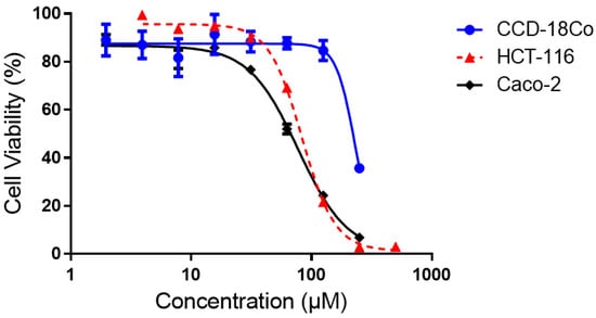 Concentration-effect curves of compound 4 against HCT-116, Caco-2 and CCD-18Co cell lines.