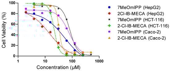 Based on the results obtained, compound 4 showed higher cytotoxicity against the HepG2 cell line (IC50 = 30 ± 7 μM) (Table 2), a hepatocellular carcinoma cell line, than against the colorectal cancer cell lines. It also exhibited cytotoxicity of the same order of magnitude to 2-Cl-IB-MECA (Figure 8), a highly potent hA3AR-selective agonist. This result suggests that compound 4, a hA3AR-selective partial agonist, can exert the same cytotoxicity as the hA3AR-selective full agonist, 2-Cl-IB-MECA. This is probably due to the rapid hA3AR desensitization upon exposure of the cancer cell lines to the hA3AR full agonist, 2-Cl-IB-MECA, as a previous study by Fishman et al. showed significant downregulation of hA3AR protein level after only 18 h of IB-MECA treatment on PC-3 prostate carcinoma cells []. Compound 4 might have a lower tendency of causing hA3AR desensitization, which would account for the similar order of magnitude of cytotoxicity as 2-Cl-IB-MECA against the cancer cell lines. However, this would need to be further confirmed with a biological study on compound 4 to assess its effect towards A3AR trafficking by β-arrestin.