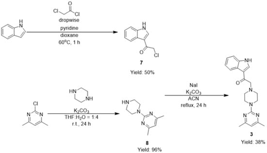 Compound 3 was synthesized based upon the synthetic scheme (Scheme 1), in which indole was treated dropwise with chloroacetylchloride in the presence of pyridine for an hour at 60 °C in dioxane to give 2-chloro-1-(1H-indol-3-yl)ethanone (7), with a yield of 50% [].