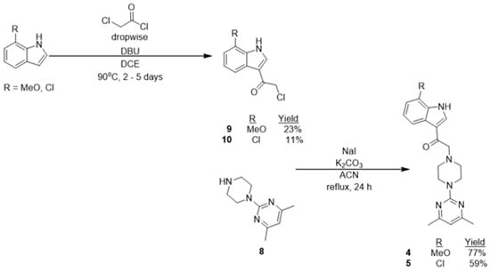 Compounds 4 and 5 were synthesized based on the synthetic scheme (Scheme 2), where both 7-methoxyindole and 7-chloroindole were treated with chloroacetylchloride in the presence of 1,8-diazabicyclo(5.4.0)undec-7-ene (DBU) under a pressurized reaction condition in dichloroethane (DCE) at 90 °C for a reaction period of 2–5 days to afford 2-chloro-1-(7-methoxy-1H-indol-3-yl)ethanone (9) and 2-chloro-1-(7-chloro-1H-indol-3-yl)ethanone (10) in 23% and 11% yield, respectively [].