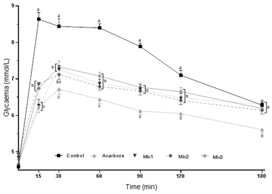 Figure 2. After 15 min of starch ingestion, mixtures 1 and 3 slightly decreased glycemia, but to a level comparable with that of the acarbose group. After 30, 60, 90, and 120 min of the starch gavage, a similar glycemia decrease was noted in all three mixture groups compared to that of the control group; however, the lowest glycemia was still found in the acarbose group. At the end of the StTT, glycemia was significantly reduced by all three mixtures; however, in the Mix1 and Mix2 groups, it was slightly more reduced and comparable with that of the acarbose group (180 min of the test) than in the Mix3 group. Moreover, the AUC values for the SuTT and StTT were similar among the mixture groups and were significantly lower than that of the control group; however, the lowest AUC values were still noted in the acarbose group (