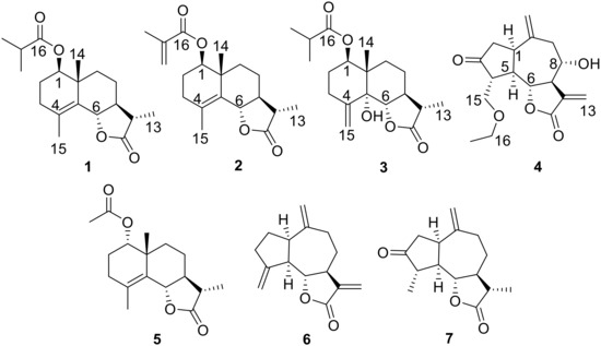 Seven sesquiterpenoids were isolated from A. vestita, including three new eudesmanolides (1–3) and one new guaianolide (4). The result was in agreement with the report suggesting that the sesquiterpenoids were the main secondary metabolites from A. vestita [6,7]. The quality of the sesquiterpenoids we obtained was insufficient and more experiments should be done to optimize the extraction and separation of these compounds.
