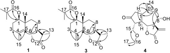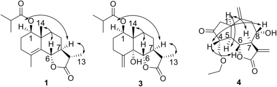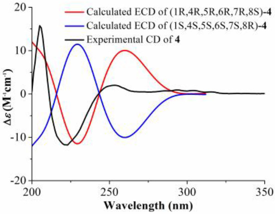 Compound 4, obtained as a pale yellow oil, was found to have the molecular formula C17H22O5, as determined through HR-ESI-MS ([M + H]+ peak at m/z 307.1540, calc for C17H23O5, 307.1546). The IR spectrum indicated a hydroxyl group (3431 cm−1) and a carbonyl group (1738 cm−1). The 1H NMR spectrum of 4 (Table 1) showed signals of two oxygenated methane protons at δH 4.02 (t, J = 8.6 Hz, H-6) and 3.94 (m, H-8), two oxygenated methylene protons at δH 3.91 (dd, J = 9.1, 2.7 Hz, H-15a), 3.70 (dd, J = 9.1, 2.7 Hz, H-15b), and 3.47 (m, H2-16), and two terminal double bonds at δH 6.39 (s, H-13a), 6.31 (s, H-13b), 5.08 (s, H-14a), and 4.87 (s, H-14b). The 13C NMR spectrum (Table 1) indicated 17 C-atom signals which were classified by a DEPT experiment into one ketone carbonyl at δC 216.8 (C-3), one unsaturated ester carbonyl at δC 169.6 (C-12), two terminal olefinic carbons at δC 125.2 (C-13) and 115.9 (C-14), and four oxygenated carbons at δC 81.8 (C-6), 73.1 (C-8), 68.9 (C-15), and 66.7 (C-16). The above information suggested that compound 4 was a guaianolide and similar to grosheimin [16] except for a ethoxymethyl group in 4. In the HMBC spectrum (Figure 2), correlations were observed from H2-16 to C-15 and C-17; from H-1 to C-5, C-10, and C-14; and from H2-9 to C-1, C-7, C-8, C-10, and C-14, indicating that the ethoxymethyl group was attached to C-15. The relative configuration of 4 was established by the NOESY experiment, by which the correlations from H-4 to H-6 and H-8, and from H-1 to H-5 and H-7, indicated that H-4, H-6, and H-8 were β-oriented, and H-1, H-5, and H-7 were α-oriented (Figure 3). The absolute configuration of 4 was assigned as (1R,4R,5R,6R,7R,8S) based on the fact that the calculated ECD curve for (1R,4R,5R,6R,7R,8S)-4 agreed well with the experimental spectrum for 4 (Figure 6). The chemical structure of compound 4 was elucidated as (1R,4R,5R,6R,7R,8S)-15-ethoxymethyl-2-oxo-8-hydroxy-guaia-10(14),11(13)-dien-12,6-olide, named artemivestinolide G (4).