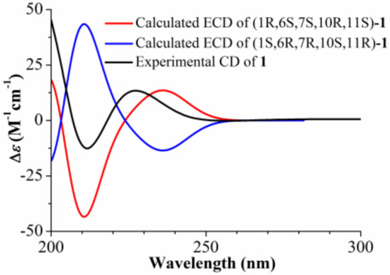 Compound 1 was obtained as a colorless gum and the molecular formula was established as C19H28O4 by HR-ESI-MS at m/z 343.1881 ([M + Na]+; calcd. 343.1880). The IR spectrum of 1 showed the characteristic absorption bands for carbonyl groups (1782 and 1729 cm−1) and double bond (1625 cm−1). The 1H NMR data of 1 (Table 1) exhibited the appearance of one secondary methyl at δH 1.23 (d, J = 7.2 Hz, H3-13), two tertiary methyl groups at δH 1.19 (s, H3-14) and 1.85 (s, H3-15), and two oxymethine protons at δH 4.75 (dd, J = 11.5, 2.8 Hz, H-1) and δH 4.55 (d, J = 11.2 Hz, H-6). Furthermore, methylene proton at δH 2.55 (m, H-17) and two secondary methyl groups at δH 1.17 (d, J = 7.0 Hz, H3-18) and 1.18 (d, J = 7.0 Hz, H3-19) revealed the presence of an isobutyrate group in the molecule. The 13C NMR spectrum (Table 1) indicated 19 carbon resonances, including two ester carbonyls at δC 178.7 (C-12) and 176.6 (C-16), two olefinic carbons at δC 126.4 (C-4) and 128.6 (C-5), and two oxygenated carbons at δC 78.9 (C-1) and 82.6 (C-6). The above NMR spectroscopic data and the degrees of unsaturation suggested that this compound was a sesquiterpene lactone containing three rings. Considering its biological source, it should be an eudesm-12,6-olide derivative [6]. In the HMBC spectrum (Figure 2), correlations were observed from H-1 to C-16 and from H-17 to C-1, indicating that an isobutyrate group was attached to C-1. The HMBC correlations of H3-15 to C-3, C-4, and C-5 allowed the assignment of the olefinic carbons at C-4 and C-5. The HMBC correlations of H-6 to C-5, C-7, and C-8 confirmed the 12,6-olide. The relative stereochemistry of 1 was established by the NOESY spectrum (Figure 3). The NOESY correlations between H3-14 with H-6, and between H-7 with H-1 and H3-13 indicated that H3-14 and H-6 were β-oriented, and H-1, H-7, and H3-13 were α-oriented (Figure 2). The absolute configuration at C-6 of 1 was determined to be S from the CD spectrum using empirical rules of π–π * transition of α,β-unsaturated γ-lactones [6,14], in which a negative Cotton effect was observed at 212 nm. Furthermore, the absolute configuration of 1 was assigned as (1R,6S,7S,10R,11S) based on the fact that the calculated ECD curve for (1R,6S,7S,10R,11S)-1 agreed well with the experimental spectrum for 1 (Figure 4). Thus, compound 1 was elucidated as (1R,6S,7S,10R,11S)-1-isobutyryloxy-eudesma-4(5)-en-12,6-olide, named artemivestinolide D (1).