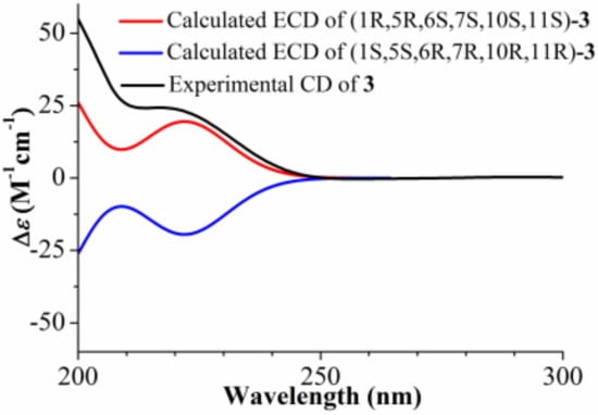 Compound 3 was obtained as a colorless gum and the molecular formula was established as C19H28O5 by HR-ESI-MS at m/z 354.2280 ([M + NH4]+; calcd. 354.2275). The overall appearance of 1H and 13C NMR spectra of 3 are highly similar to those of artemivestinolide C [6]. The most obvious distinction is an isobutyrate group (δH 2.51, 1.16, and 1.17; δC 176.3, 34.4, 19.0, and 19.1) at C-1 (δC 74.1). The cross peaks at H-1 (δH 5.34, dd, J = 11.0, 4.5 Hz) with C-16 in the HMBC spectrum confirmed this (Figure 2). The β-orientation was assigned to C-14 and α-orientation was assigned to 5-OH based on 1H NMR signals of H-1 and H3-14 and 13C NMR signals of C-5, C-10, and C-14 by comparing those with the literature data of eudesmane-type sesquiterpenoid [15]. The NOESY correlations between H3-14 (δH 1.00, s) with H-6 (δH 4.25, d, J = 9.8 Hz), and between H-7 (δH 2.39, m) with H-1 and H3-13 (δH 1.23, d, J = 7.2 Hz) indicated that H3-14 and H-6 were β-oriented, and H-1, H-7, and H3-13 were α-oriented (Figure 3). The absolute configuration at C-5 of 3 was determined as R based on the positive Cotton effect at about 200 nm in the CD experimental spectrum [6]. Furthermore, the absolute configuration of 3 was assigned as (1R,5R,6S,7S,10S,11S) based on the calculated ECD curve for (1R,5R,6S,7S,10S,11S)-3 agreed well with the experimental spectrum for 3 (Figure 5). Thus, compound 3 was elucidated as (1R,5R,6S,7S,10S,11S)-1-isobutyryloxy-eudesma-4(15)-en-12,6-olide, named artemivestinolide F (3).
