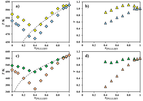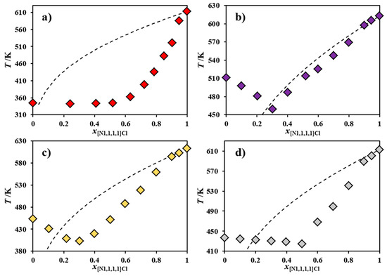Experimental solid–liquid equilibrium phase diagram for the binary systems composed of [N1,1,1,1]Cl and (a) [N4,4,4,4]Cl, (b) [NBz,1,1,1]Cl [21], (c) [NBz,2,2,2]Cl and (d) [NBz,4,4,4]Cl. The ideal solid–liquid equilibrium phase diagram is also included, in each case, as a dashed line.