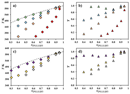 Figure 2 plots the melting curves and activity coefficients of [N1,1,1,1]Cl in the chloride-based systems reported in Figure 1 and in the systems composed of [N1,1,1,1]Cl and [NBz,1,1,1]Cl, [NH4]Cl, [N2,2,2,2]Cl, or [N3,3,3,3]Cl, which were previously published [21]. For visual simplicity, symmetric alkylammonium and benzyl alkylammonium systems are reported in separate diagrams.