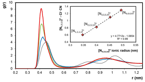 Radial distribution functions (RDFs) of chloride around the [N1,1,1,1]+ cation in the corresponding chloride–salt hypothetical pure liquid phase (dashed line) and in the equimolar liquid phase mixtures of [N1,1,1,1]Cl + [N2,2,2,2]Cl (──), [N1,1,1,1]Cl + [N3,3,3,3]Cl (──) and [N1,1,1,1]Cl + [N4,4,4,4]Cl (──). In each case, the x-axis represents the distance of the chloride ion from the central nitrogen of the cation. Inset: Chloride coordination number (CN) in the presented systems at r = 0.414 nm as a function of the ionic radius of the largest component in the system [27].