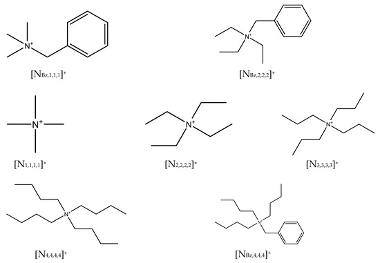 In this work, the salts tetramethylammonium chloride ([N1,1,1,1]Cl), tetrabutylammonium chloride ([N4,4,4,4]Cl), benzyltrimethylammonium chloride ([NBz,1,1,1]Cl), benzyltriethylammonium chloride ([NBz,2,2,2]Cl), benzyltributylammonium chloride ([NBz,4,4,4]Cl), tetraethylammonium bromide ([N2,2,2,2]Br), and tetrapropylammonium bromide ([N3,3,3,3]Br) were experimentally used. Their CAS number, supplier, purity, and melting properties are reported in Table 2, while the chemical structure of their cations is depicted in Figure 7. Since the salts listed above are hygroscopic, they were carefully dried under vacuum (0.1 Pa) and constant stirring at room temperature (298 K) for at least 72 h prior to use. The water content of the salts after drying was verified using a Metrohm 831 Karl Fischer coulometer, with the analyte Hydranal Coulomat AG from Riedel-de-Haen, and is presented in Table 2.
