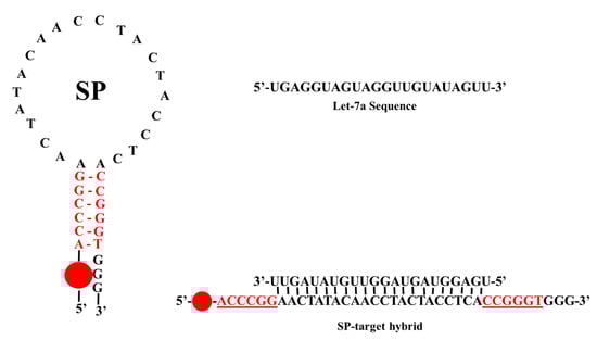 Structure of the SP and that of SP-target hybrid. The SP-target hybrid is shown in the bottom right (bases of the self-complementary stem are shown in red and are underlined). Let-7a (L7a) target sequence is also shown in the top right panel.