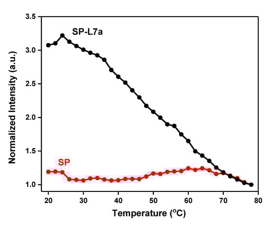 Melting profiles of SP in the absence and presence of L7a target. The corresponding raw fluorescence spectra are presented in Figures S1 and S2 of the Supplementary Materials.