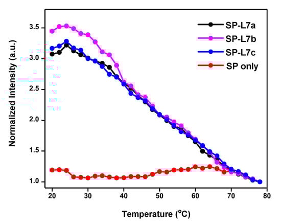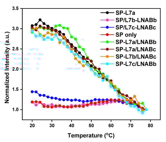 Melting profiles of hybrids of L7b-LNABb and L7c-LNABc formed between L7b and L7c in the presence of LNABs. The hybrids generate very low fluorescence signals that are essentially the inherent (background) fluorescence of unhybridized SP in hairpin conformation. The melting profile for SP-L7a is also shown for comparison. Likewise, hybrids of SP-L7a in the presence of LNABb, SP-L7a in the presence of LNABc, SP-L7b in the presence of LNABc, and SP-L7c in the presence of LNABb are shown. See Figures S1, S2, S5, S6, and S11–S14 in the Supplementary Materials for the corresponding raw fluorescence spectra.