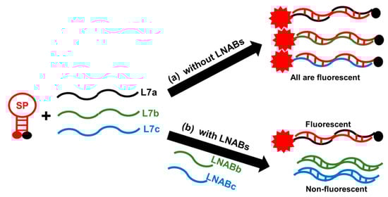 Schematic of sequence-specific hybridization between the SP and L7a, L7b, and L7c sequences in the absence and presence of LNABs. In the absence of LNABs (a), SP hybridizes with L7a to form SP-L7a hybrid, which is fluorescent. Non-specific interaction between the SP and homologous sequences, L7b and L7c, also gives rise to highly-fluorescent hybrids of SP-L7b and SP-L7c. When LNABs are present (b), only L7a specifically hybridizes with the SP to form a highly-fluorescent SP-L7a hybrid. The LNABs interact with homologous sequences, L7b and L7c, and produce non-fluorescent hybrids of L7b-LNABb and L7c-LNABc.