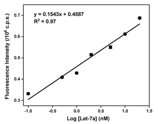 MicroRNAs (miRNA) are short, non-coding ribonucleic acid strands that regulate several processes in biology [,]. They contribute to the initiation and progression of various diseases, such as viral infections, neurological diseases, and cancer, and miRNA levels have been shown to correlate well with such diseased states [,,]. As a result, miRNAs constitute an important class of therapeutic and diagnostic (theranostic) biomarkers [,,]. Specifically, the let-7 family of miRNA has been implicated in breast and lung cancers, and their levels may be used as a diagnostic tool for detection [,,,,,]. Given this fact, accurate detection of members of the let-7a,b,c homologous miRNA family is crucial to the early detection and prognosis of these types of cancer. Several methods have been used in the detection of miRNAs. These methods include PCR-based methods, in situ hybridization, microarray methods, and northern blotting [,,,,,]. Other methods include electrochemical, colorimetric, spectroscopic, and nucleic acid amplification techniques [,,,,,,,]. Although they are selective, PCR-based techniques require a purified RNA sample and can be time- and labor-intensive [,]. Northern blotting presents low sensitivity, requires a large amount of sample, and is cumbersome [,,]. Microarray methods have the advantage of high throughput, but they have low sensitivity and specificity [,,]. The electrochemical, colorimetric, and spectroscopic techniques reported so far for miRNA detection are complicated, with procedures that are rather involved, thereby making them less attractive for routine miRNA detection [,,,]. Nucleic acid amplification methods are sensitive, but they come with complex reaction or hybridization mixtures, and unintended mismatch nucleic acids may also be amplified due to non-specific hybridization, therefore presenting high levels of background signals [,,]. Thus, mismatch nucleic acid sequences may present a challenge, even with nucleic acid amplification methods that are very sensitive. In addition to all of these limitations, all the methods reported so far for miRNA detection involve a single probe for a single target miRNA sequence; none of the methods so far reported has used a single probe for multiple miRNA sequences.