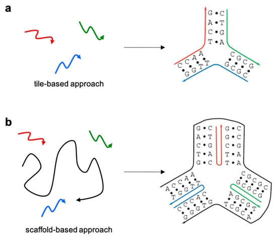 Several years after the foundation of DNA nanotechnology, an alternative self-assembling strategy was developed, later called scaffolded DNA origami []. The main difference between the two assembly strategies relies on the presence or absence of a long single-stranded DNA (termed scaffold or template) in the reaction mixture (Figure 1). In the tile-based approach, originally developed by Seeman, relatively short oligonucleotides (20–40 bases long) are designed to intertwine one another into branched motifs of defined geometry [], following a rather strict principle of sequence-symmetry minimization []. According to this principle, sequences participating in the formation of the motif are chosen to be maximally different from one another, such that competitive formation of alternative secondary structures is minimized (Figure 1a). Despite careful design efforts, the relatively small size and high structural flexibility of such tiles inevitably result in their partial dissociation at room temperature. A way to escape this drawback is to connect tiles into large periodic lattices through cohesion of their complementary sticky-ends. Alternatively, the intrinsic dynamics of such small DNA motifs can be advantageously used to generate complex reaction networks and DNA circuits, whose kinetic behavior is governed by predictable single-strand displacement mechanisms [,,,]. A major bottleneck to the successful implementation of this self-assembly strategy is, however, the necessity to achieve a high control over the stoichiometry and purity of the constituent oligonucleotides, resulting in error-prone and lengthy synthetic processes.