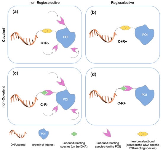 Several approaches have been developed until now and are in continuous evolution to enable the binding of a protein of interest (POI) to a DNA molecule. The methods used for the synthesis of DNA-protein hybrids typically include chemical conjugation, enzymatic ligation or a combination of both, and are applied either to native proteins or their genetically modified variants. A convenient way to classify these strategies relies on two parameters of the newly established interaction: strength and selectivity. For the strength of the bond, we intend the possibility for the DNA-protein interaction to be either covalent, and thus mainly strong and irreversible, or non-covalent and therefore weaker and amenable to dissociate easily. In addition, the newly formed bond may be directed exclusively to one specific site of the POI (i.e., the DNA-protein interaction is regioselective) or address many sites, which are chemically identical and spatially indistinguishable (i.e., the DNA-protein interaction is non-regioselective). Of course, a pre-requisite of all these approaches is to be chemo-selective, meaning that the reaction under investigation is designed to take place only among specific chemical groups appended respectively to the DNA and protein molecule, although in few cases alternative reaction pathways and outcomes cannot be completely excluded. According to this definition, we can distinguish four classes of DNA-protein conjugation methods (Figure 2), in which the newly established interaction is either covalent (C+) or non-covalent (C-) and, for each of these two scenarios, may or may not display regioselectivity (R+ or R-). The four strategies described in this section refer to the establishment of a “link” between a single-stranded DNA and a POI, giving rise to properly called DNA-protein conjugates. Some of these strategies have been also successfully used for further protein decoration of larger DNA constructs, as described in Section 2.3, resulting in the formation of DNA-protein nanostructures.