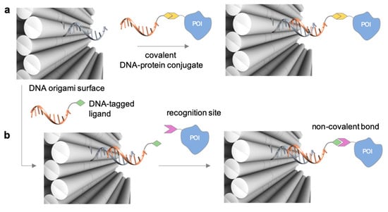 A detailed description of the purification procedures adopted for the isolation of DNA-protein conjugates goes beyond the purpose if this review and the interested reader may find important references to previous works in [,,,] and references therein. As a general rule, covalently linked conjugates are typically purified by chromatographic techniques, using size exclusion, ion exchange, affinity-based phases and in some cases a combination of them. Non-covalent conjugates instead are more challenging—if not even impossible—to isolate and the chance of success is highly dependent on the binding strength of the ligand. The problem becomes more difficult to solve when the DNA-protein conjugate is the result of non-regioselective methods. In those instances, the reaction products are most probably a distribution of multiple species that differ in the number of attached DNA strands and their relative location on the protein. Despite advanced analytical techniques, such as mass spectrometry [], may enable to characterize the mixture of products, isolation of the desired DNA-protein species is still an extremely challenging task. Once the DNA-protein conjugate has been produced and isolated, the single-stranded DNA tag can be employed for anchoring the POI at the desired position of a nanostructured DNA template, obtained either by tile- or scaffold-based strategies. In principle, this final construct can be realized in two ways. In the first route, the DNA-protein conjugate (mainly covalently bound) is hybridized to the complementary strand protruding out of the DNA surface at the desired position (Figure 3a). In the second route, the two complementary strands are first hybridized at the selected position, exposing the DNA handle to which the protein will be further (normally non-covalently) linked (Figure 3b). Thus, whereas the first scaffolding strategy is driven by DNA hybridization, the second procedure relies on the binding affinity between the ligand and the protein receptor. In both cases, the final architecture will be constituted by one or several proteins tethered to a common DNA template and pre-organized in space with nanometer control over their mutual distance and relative position to the DNA walls.