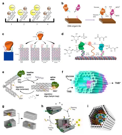 Whereas large mono- and two-dimensional nanostructures have been extensively used for the study of proximity effects in artificial enzyme cascades, the application of 3D templates for the same purpose has been initially limited to simple DNA junction motifs. A representative example, reported by Yan’s group in 2014 (Figure 4d), describes a two-enzyme cascade consisting of a glucose-6-phosphate dehydrogenase (G6pDH) and a malic dehydrogenase (MDH) displayed on a DNA double-crossover tile scaffold []. The production of NADH by G6pDH is subsequently used by MDH for reduction of oxaloacetate to malic acid. To facilitate channeling between the two enzymes, an NAD+-functionalized DNA swinging arm has been placed between the two enzymes and proven to mediate local diffusive transport through transient binding. The final construct showed not only enhanced enzymatic activity but also high specificity in a complex environment. In a different application, the distance between an enzyme and its cofactor has been varied by attaching the two components to the extremities of a DNA tweezer []. Upon addition of specific DNA actuators, the entire construct could be switched from an open to a closed configuration, respectively associated with an inactive and active state of the enzyme complex (Figure 4e). These and other similar examples highlight how the activity of an enzyme complex can be controlled via DNA, either through confinement of the reacting partners at defined positions in space or through dynamic manipulation of their range of interaction [,,].