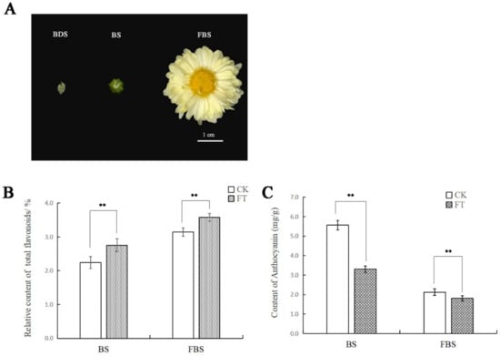 Content of total flavonoids and anthocyanins in different stages of “Hangju”. (A) Morphological characteristics of “Hangju” capitula in different growth stages: flower bud differentiation stage (BDS), bud stage (BS) and flower bloom stage (FBS). Content of total flavonoids (B) and anthocyanin (C) in different stages after flooding stress. Data represent mean values ± SD of three independent measurements. ** indicates a significant difference at p < 0.01.