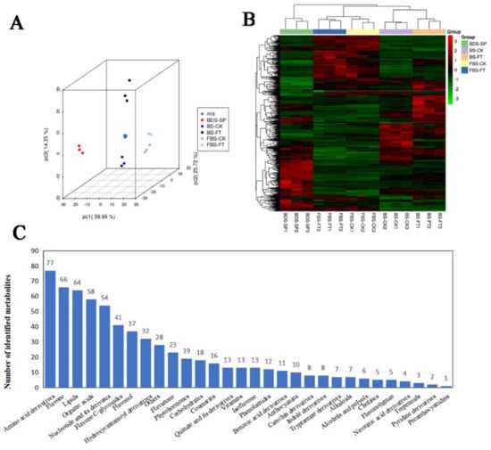 Quality control analysis and metabolite identification of all samples. (A) Score plot of principal components analysis for all samples based on mass spectrometry data. Mix refers to the mixing of all samples as a quality control sample. SP refers to the starting point of flooding; CK refers to the control group; FT refers to the flooding treatment group. (B) Heat map of all samples by hierarchical cluster analysis. (C) Classes and quantity of identified metabolites.