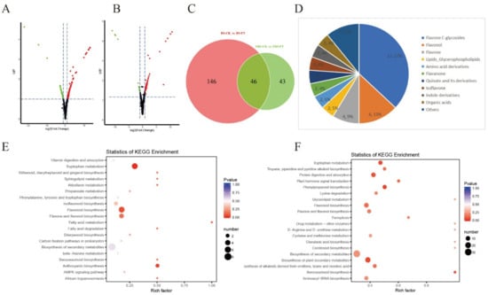 The differential metabolites analysis in BS and FBS, respectively. The volcano plots show the differential metabolites expression levels after flooding stress in BS (A) and FBS (B). Green dots represent down-regulated differentially expressed metabolites; red dots represent up-regulated differentially expressed metabolites; and black dots represent non-differentially expressed metabolites. (C) The Venn diagram shows the overlapping and specific differential metabolites from groups of BS-CK vs. BS-FT and FBS-CK vs. FBS-FT. (D) The pie chart shows classes and quantity of 46 overlapping metabolites from Figure 3C. Enrichment of differential metabolites to distinct KEGG pathways from BS (E) and FBS (F). The abscissa indicates the rich factor of each pathway, the ordinate is the name of pathway, and the color of the point reflects the P value. The size of the dots represents the number of differential metabolites enriched.