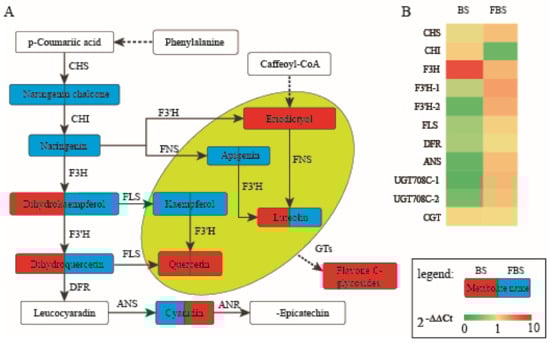 The differential metabolites interacted in the organism to form different pathways, and the differential metabolites were annotated and displayed using the KEGG database. The results showed that the pathway with the largest number of differential metabolites was biosynthesis of secondary metabolites both in the BS and FBS stages (Figure 3E,F). Then, according to the number of differential metabolites and the degree of enrichment, the order of tryptophan metabolism, flavonoid biosynthesis and flavone and flavonol biosynthesis was followed. Plant secondary metabolites are non-essential small molecular organic compounds that are produced by secondary metabolism, which usually possess bioactivity.