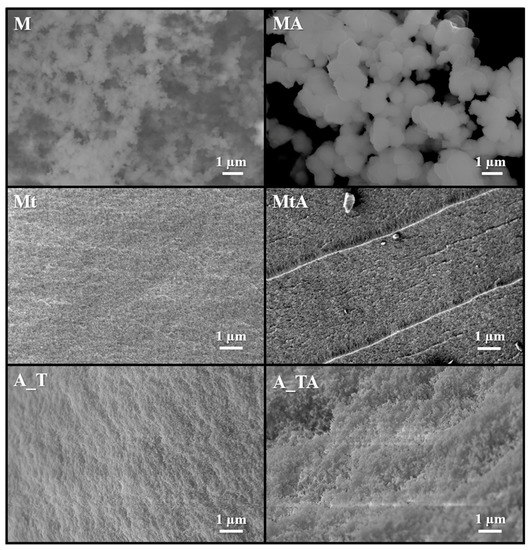 SEM images of the adsorbents M and MA (Reprinted with permission from Reference [54] Copyright (2019) Elsevier), and Mt, MtA, A_T and A_TA.
