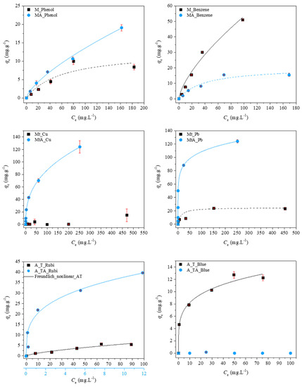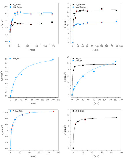 For phenol and benzene adsorption, the equilibrium is practically achieved after 30 min; the pairs adsorbent-adsorbate with lower removal efficiencies (M_Phenol and MA_Benzene) showed higher values of k2, indicating a shorter time to reach the equilibrium, when compared with MA_Phenol and M_Benzene pairs. For the case of copper and lead, the process is fast at the beginning, but equilibrium is not reached, which can justify the significant differences between the experimental equilibrium and model uptake. In this case, the adsorption process continues slowly for several hours. This can be an indication that the amine groups became less available for adsorption after an initial uptake; hence, the process becomes slower. The same trend obtained for the VOCs was observed for the Pb removal, with MtA_Pb having a significantly lower value of k2 than Mt_Pb. In the case of the dyes, the adsorption process is also very fast, since after less than 30 min the equilibrium is already reached for both cases. The electrostatic interaction plays an important role in this kinetics, as the pollutants are attracted to the adsorbent due to the different surface charges, as already mentioned.
