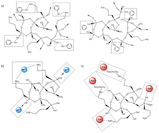 Proposed adsorption mechanisms between silica aerogels and (a) volatile organic compounds, (b) heavy metals and (c) textile dyes.