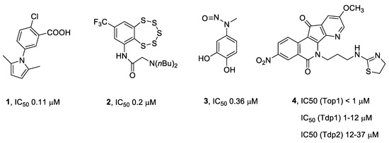 Several potent small molecule inhibitors of Tdp1 that inhibit the enzyme at micro- and submicromolar levels have been reported [5,6,7]. These Tdp1 inhibitors include compounds of different structural classes from synthetic, natural product, and semi-synthetic origins [5,6,7]. Amongst the most potent of the synthetic Tdp1 inhibitors are a pyrrole derivative 1 [8], benzopentathiepine 2 [9], and methyl-3,4-dephostatin 3 [10] (Figure 1). Pan-DNA repair enzyme inhibitors have also been developed. For example, compound 4 (7-azaisoquinoline derivative) inhibits three DNA repair enzymes (Top1, Tdp1, and Tdp2) [11].