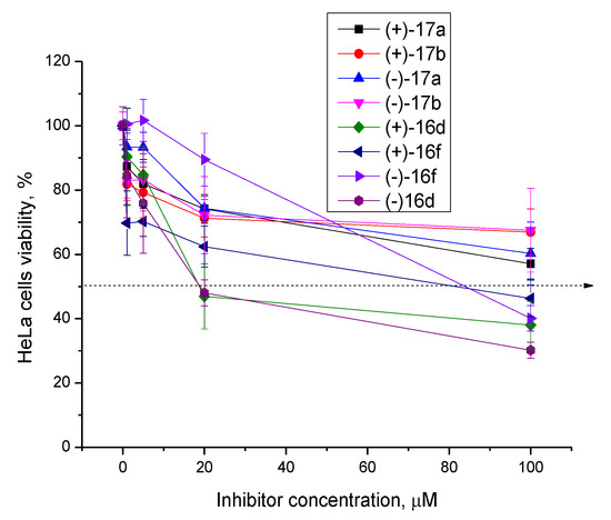 In general, we can say that the increase in the size of the substituent led to very good inhibitory activity in the concentration range of 18–122 nM. The presence of a halogen atom as a substituent in the terminal aromatic ring, as a rule, increases the inhibitory activity of the compounds. At the same time, the location and nature of the halogen atom as well as the number of halogen atoms in the terminal aromatic ring did not significantly affect the level of inhibitory activity. Replacing the O-/S- methylene linker (17a–h) with a piperazinemethylene linker (17i, 17j) also did not have significant effect. As the configuration of the optical center of the core of usnic acid is not of fundamental importance, we can only note a slight tendency to increase the inhibitory activity of (−)-enantiomers for compounds containing a chlorine atom in the terminal aromatic ring (17d,f,h).