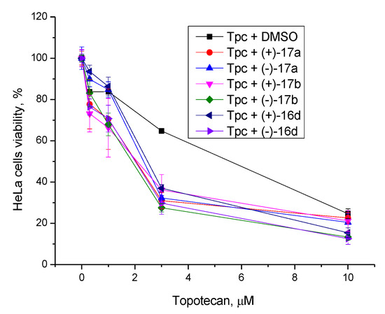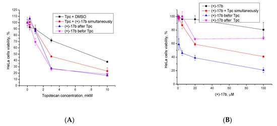 Dose-dependent action of (A) 2 µM topotecan in combination with 20 µM (+)-17b and (B) 20 µM (+)-17b in combination with 2 µM topotecan (Tpc) on HeLa cell viability using the MTT method.