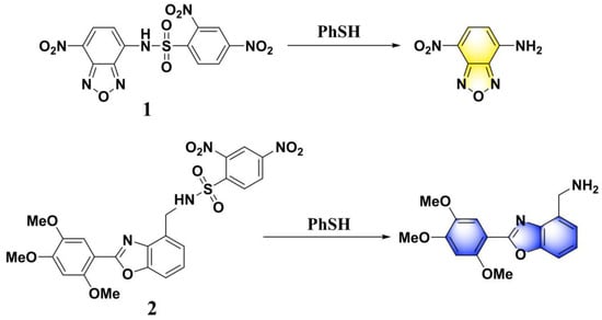 Wang et. al. reported the first fluorescent probe (1) for the selective detection of PhSH [51]. The probe was obtained by incorporating DNBS into an NBD (7-nitro-2,1,3-benzoxadiazole) fluorophore (Figure 1). Due to the blockage of the ICT (intramolecular charge transfer) process and the quenching effects of the DNBS moiety, probe 1 was non-fluorescent. In an aqueous buffer solution, probe 1 can display a fast turn-on fluorescence response due to the effective cleavage of the sulfonamide by PhSH via an SNAr (nucleophilic aromatic substitution) process and, thus, release the free fluorophore NBD-NH2. Notably, the probe demonstrates excellent selectivity over aliphatic thiols and other common nucleophiles. Considering the relatively low quantum yield (Φ = 0.02) and low sensitivity (limit of detection, LOD = 2 μM) of the probe 1 system, the same research group subsequently developed a novel PET (photoinduced electron transfer)-based fluorescent probe (2) for sensing PhSH [52], which displayed a much higher quantum yield (Φ = 0.39; quantum yield was determined by reference to harmine in 0.1 N H2SO4 (Φ’ = 0.45)) and a higher sensitivity (LOD = 0.2 μM). Probe 2 also displayed excellent specificity and can work in a phosphate buffer under physiological conditions (pH 7.3, 0.01 M).