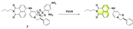 Since the pioneering works by Wang and co-workers, considerable efforts were expended for the development of efficient fluorescent PhSH probes. By appending DNBS to a naphthalimide-derived fluorophore, Han and Deng et al. designed a reaction-based fluorescent, probe (3) (Figure 2) for PhSH [53]. Probe 3 was shown to be selective and sensitive (LOD = 20 nM), which was presumably ascribed to the suitable electronic structure and spectroscopic property of the probe, benefiting from the linker moiety of 2,3-dihydroimidazo-[1,2-a] pyridine. In the presence of PhSH (ca. 2.0 equivalents), the probe solution showed a remarkable turn-on fluorescent response (>60-fold) with a fluorescence quantum yield of 0.36. Furthermore, probe 3 was used successfully for monitoring PhSH in water samples from rivers and chemical factories; the feasibility of the proposed assay was also validated using the traditional GC–FPD (gas chromatography–flame photometric detector) method.