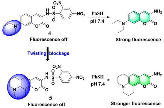 By adopting coumarin-3-amino as the fluorophore, Yang et al. developed a fluorescent PhSH probe (4) (Figure 3) [54]. In a phosphate buffer solution, probe 4 displayed a significant fluorescence enhancement (>280-fold) with a large Stokes shift (145 nm) for sensing PhSH. Probe 4 also exhibited excellent selectivity for PhSH over relevant aliphatic thiols. Thus, the probe was directly applied to detection PhSH in real water samples, which produced good recovery results, indicating that probe 4 can serve as a promising tool for sensing thiophenol in the environmental field. To further improve the analytical performances of the coumarin-based fluorescent probe, the same research group designed a new probe (5) for PhSH via a twist-blockage strategy [55]. The benzo[ij]quinolizine coumarin-based probe (5) exhibited more advantageous features, including higher fluorescence enhancement (700-fold) and sensitivity (LOD = 4.5 nM). Probe 5 was also employed for imaging exogenous PhSH in HEK293 cells.