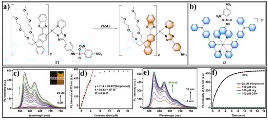 Luminescent heavy-metal complexes showed some favorable photophysical characteristics for sensing and bioimaging applications, such as a large Stokes shift and long emission lifetime, which are very helpful for eliminating autofluorescence in complicated biological and environmental samples [64,65,66,67,68,69,70]. Lu et al. presented a cyclometalated iridium-based phosphorescent probe (11) (Figure 5) for sensing PhSH [71]. Probe 11 is almost non-fluorescent due to the PET quenching process. PhSH can trigger a distinct turn-on photoluminescence for the probe system. The photoluminescence lifetimes were determined to be 1.99 μs for de-aerated and 0.50 μs for aerated samples. The photoluminescence response was also very sensitive (k = 91.92 × 106 M−1) with a determined LOD of 2.5 nM. Recently, Zhang and Pu et al. reported another cyclometalated iridium(III) complex (12) (Figure 5) for detecting PhSH [72].