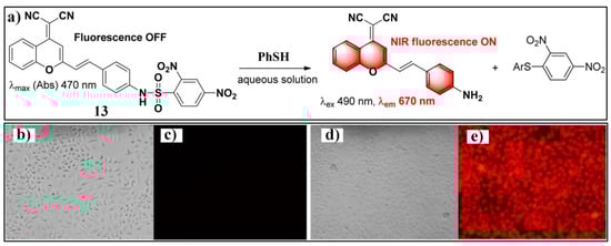 (a) Structure and reaction of probe 13 with PhSH. (b) Bright-field images of HeLa cells after being treated with probe 13. (d) HeLa cells preincubated with thiophenol and then incubated with probe 13. (c,e) Fluorescence images of (b,d), respectively. Reproduced with permission from Reference [76]; copyright American Chemical Society.