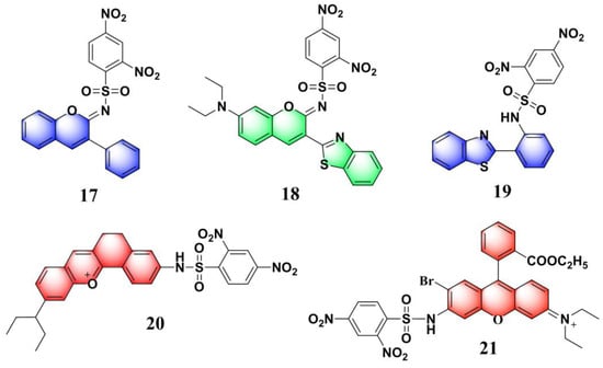 Near-infrared (NIR) fluorescent probes attracted great attention due to their better capability for deep tissue penetration and reducing phototoxicity [73,74,75]. Up to now, several near-infrared probes based on the recognition unit of 2,4-dinitrobenzenesulfonic amide were reported for sensing PhSH. Based on a dicyanomethylene–benzopyran-derived dye, Feng et al. developed an NIR fluorescent probe (13) (Figure 6a) for sensing and imaging PhSH [76]. Upon addition of PhSH, the probe buffer solution displayed a distinct turn-on NIR fluorescence around 670 nm. The probe system showed large Stokes shift, high selectivity, and fast response time. The linear dynamic range was 1–10 μM with an LOD of 0.15 μM. Furthermore, probe 13 was demonstrated to be capable of imaging PhSH in living Hela cells (Figure 6b–e). Subsequently, three other NIR fluorescent PhSH probes (14 [77], 15 [78,79], and 16 [79]) emerged by adopting different fluorophores, including porphyrin, dicyanoisophorone, and Nile blue (Figure 7). By incorporating 2,4-dinitrobenzenesulfonic amide into other fluorophores, a number of fluorescent PhSH probes (17 [80], 18 [80], 19 [81], 20 [82], and 21 [83]) were also constructed (Figure 8).