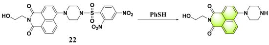 Recently, by introducing piperazine as a linker for connecting the fluorophore and the recognition moiety, a series of new fluorescent probes were developed for monitoring PhSH. Yu and Li et al. reported a 1,8-naphthalimide-based fluorescent PhSH probe (22) (Figure 9) [84]. In a mixed solvent of water/ethanol (7:3, v/v), the probe displayed a turn-on fluorescence response toward PhSH, which can be ascribed to target-induced cleavage of the 2,4-dinitrobenzenesulfonyl group and, thus, the release of the piperazine-appended 1,8-naphthalimide fluorophore. This sensing process was verified by NMR (nuclear magnetic resonance) and MS (mass spectroscopy) studies. Probe 22 was also shown to be very sensitive for PhSH, as the LOD was determined to be 10.3 nM. Based on the similar designing strategy, several other fluorescent probes (23 [85], 24 [86], 25 [79], and 26 [87]) bearing a piperazine linker were also built for the detection of PhSH (Figure 10). Notably, probe 26, which was developed by He and Chen et al., consisted of two types of fluorophores (naphthalimide and dansyl) linked by the piperazine group. The dansyl group behaves not only as a recognition moiety but also as a signaling reporter. Probe 26 alone displayed a typical naphthalimide emission at 534 nm, while a blue-shifted peak at 414 nm was gradually observed in the presence of PhSH, which can be attributed to the release of the dansyl derivative. Thus, the ratiometric detection for PhSH was achieved.
