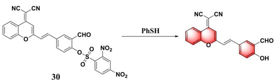 By incorporating 2,4-dinitrobenzene-sulfonate into an aldehyded dicyanomethylene–benzopyran-derived dye, Li et al. constructed near-infrared probe (30) (Figure 14) for colorimetric and fluorogenic detection of PhSH [94]. With the addition of PhSH to a phosphate buffer/DMSO (v/v, 1:1, pH = 7.4) solution of probe 30, the probe solution displayed a distinct color change from yellow to red with the evolution of a fluorescence emission at 658 nm. The probe displayed excellent selectivity for PhSH amongst a selection of nucleophiles, including aniline, Cys, Hcy, and GSH. The LOD was calculated to be 0.22 μM. The probe was also employed for sensing PhSH in tap water and in river water samples, as well as imaging the target in living Hela cells.