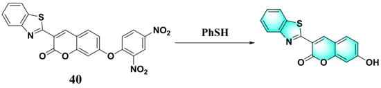 Lin et al. firstly proposed constructing a fluorescent PhSH probe (40) (Figure 16) by exploiting the target-induced thiolysis of a dinitrophenyl ether moiety [104]. The probe (40) was obtained by coupling a dinitrophenyl group to a 7-hydroxy coumarin. In a solution of phosphate buffer/DMF (N,N-dimethylformamide) (55:45, v/v, 25 mM, pH = 7.0), the probe is almost non-fluorescent (Φ = 0.006), while PhSH can effectively mediate thiolysis of dinitrophenyl ether and result in the release of the highly emissive coumarin fluorophore (Φ = 0.5). The quantum yield was calculated using the equation of Φs = Φr (ArFs/AsFr) (ns/nr)2, where As and Ar are the absorbance of the sample and the reference at the excitation wavelength, respectively, Fs and Fr are the corresponding relative integrated fluorescence intensities, n is the refractive index of the solvent, and Φs and Φr are the quantum yields of the sample and the reference, respectively; quinine sulfate (Φr = 0.546 in 1 N H2SO4) was used as the reference. The kinetic results indicated that the probe can react rapidly with the target. The spectral response of the probe solution was found to be very sensitive toward PhSH. A linear dynamic range of 4.0 nM–3.0 μM was obtained between the logarithm of ((I − I0)/I0), and the LOD was calculated to be 1.8 nM. Moreover, the probe was used for the first time to monitor PhSH in environmental and biological samples.