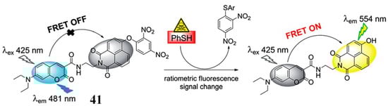 Compared with the intensity-dependent single-band emission probe, the ratiometric fluorescent probe, which relies on the change in the ratio of two emission bands, is more attractive due to its potential capability to eliminate the influence of probe distribution and instrumental difference. The fluorescence resonance energy transfer (FRET) system, which consists of two dyes (donor and acceptor), is a commonly used platform for constructing ratiometric fluorescent assays [105,106,107,108]. Feng et al. developed a FRET-based ratiometric PhSH probe (41) (Figure 17) by using a pair of fluorophores, coumarin and naphthalimide [109]. As the fluorescence of the naphthalimide acceptor was quenched by dinitrophenyl ether, probe 41 alone displayed the typical emission (λem = 481 nm) of the coumarin donor. PhSH can selectively remove the dinitrophenyl ether and trigger the occurrence of the FRET process, thus achieving a good ratiometric fluorescent response.