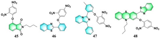 Excited-state intramolecular proton transfer (ESIPT)-based fluorescent probes are highly attractive due to their unique optical features, such as large Stokes shift, high fluorescence quantum yield, tunable structure and emission wavelength, and potential for ratiometric sensing [8,113]. By coupling 2,4-dinitrophenyl ether to a green-emissive ESIPT fluorophore, 3-hydroxyphthalimide, Song et al. synthesized a turn-on fluorescent PhSH probe (45) (Figure 20) [114]. Due to the PET process from the fluorophore to the dinitrophenyl ether moiety, probe 45 is non-fluorescent (ΦF < 0.001). Upon addition of PhSH, the dinitrophenyl ether group of the probe can be cleaved to liberate 3-hydroxyphthalimide which can undergo an ESIPT process under photoexcitation and exhibit the keto-form emission at 516 nm. The probe system displayed a large Stokes shift (161 nm). The dynamic range and LOD for sensing PhSH are 0–10 μM and 3.5 nM, respectively. By using other ESIPT fluorophores, including 2-(2′-hydroxy-phenyl)benzothiazole (HBT), an imidazo [1,5-α]pyridine derivative, and phenothiazine-HBT compound, three other fluorescent PhSH probes (46 [115,116], 47 [117], and 48 [118]) were also presented (Figure 20).