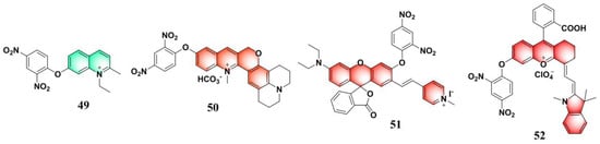 Positively charged dyes showed great potential for the construction of fluorescent probes, due to their favorable electronic structures and optical properties, improved water solubility, and mitochondrial targeting ability [119,120,121]. By using 7-hydroxy quinolinium as the fluorophore, Song et al. developed an off–on fluorescent probe (49) (Figure 21) for sensing PhSH [122]. The probe can quickly respond to PhSH with a rate constant of k = 24 M−1∙s−1. Studies on pH effects revealed that the probe can effectively react with PhSH under neutral physiological conditions. Liu and Song et al. reported a red-emissive fluorescent PhSH probe (50) (Figure 21) based on a methylated chromenoquinoline dye [123]. The probe system displayed a large Stokes shift (108 nm) and a high sensitivity (LOD = 8.1 nM) for sensing PhSH. Kinetic studies revealed that the reaction with probe 50 can be completed within 2 min. The probe also showed excellent specificity for PhSH as other nucleophilic reagents (including Cys, Hcy, GSH, and HS−) did not generate any fluorescence response. Guo et al. presented a mitochondrial-targeted fluorescent PhSH probe (51) (Figure 21) by using a rhodol–methylpyridinium derivative as the fluorophore [124]. Probe 51 can display both a distinct colorimetric and a fluorogenic response toward PhSH in a solvent of phosphate buffer (pH = 7.4, 20 mM, containing 20% DMF). Cellular co-localization experiments showed that the probe can stain mitochondria with a high coefficient (0.95) using Mito Tracker Green FM as the reference. The effects of endogenous reactive oxygen species (ROS) on the fluorescence response of probe 51 to PhSH in living cells were also inspected, which revealed that endogenous ROS could eliminate the fluorescence of the probe system. The results implied that thiophenols can participate in oxidative stress and redox regulation reactions. Zeng and Yuan et al. developed a selective NIR fluorescent probe (52) (Figure 21) for sensing and imaging PhSH by screening a library of seven fluorescent probes which were established by installing nitrobenzenesulfonyl or nitrophenyl groups onto NIR chromenylium–cyanine fluorophores [125]. The probe has both excitation and emission in the NIR region, corresponding to 680 and 706 nm, respectively. In a phosphate buffer solution (25 mM, pH 7.4, containing 1% DMSO), the emitted fluorescence intensity of probe 51 at 706 nm increased linearly with concentration of PhSH in a range of 1–15 μM with an LOD of 280 nM. Furthermore, the probe exhibited excellent biocompatibility and cell-membrane permeability, and was successfully exploited for imaging PhSH in living HeLa cells, as well as in living mice.