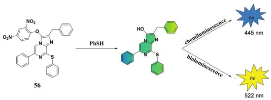 Chemiluminescence- and bioluminescence-based analytical assays have a number of advantages including simple procedures and equipment as no excitation light is needed, low background signal and high sensitivity, and good biocompatibility [132,133]. Li et al. reported a dual bioluminescent and chemiluminescent PhSH probe (56) (Figure 23) based on coelenterazine [134]. In Tris-HCl buffer (50 mM, pH 7.4) with the addition of luciferase, the probe system can be used for bioluminescent sensing of PhSH with an emission peak at 445 nm. When replacing luciferase with dimethyl sulfoxide (DMSO), the probe system can act as a chemiluminescent sensor for PhSH with an emission peak at 522 nm. Both of these luminescent assays displayed a linear range of 0.5–20 µM for PhSH. Moreover, probe 56 can be employed for quantitative chemiluminescent monitoring of PhSH in plasma samples without the addition of luciferase or DMSO.